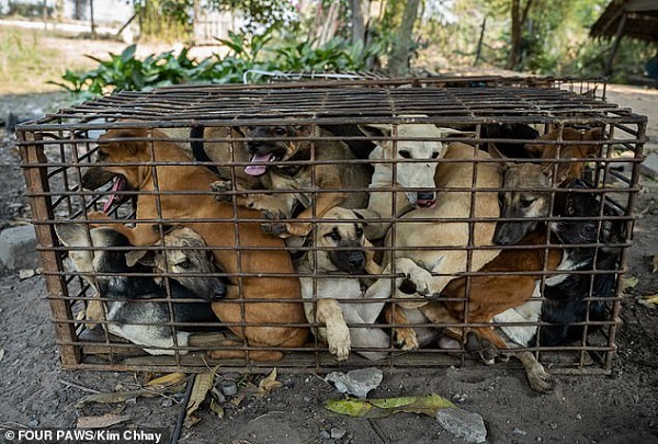 Les chiens, entassés les uns sur les autres dans des cages, étaient emmenés pour être abattus à Kampong Cham, dans le sud-est du Cambodge, le dimanche 21 février dernier.