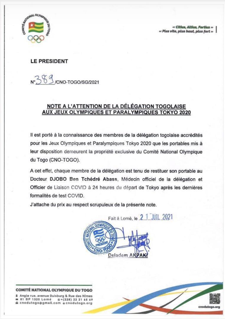 « Il est porté à la connaissance des membres de la délégation togolaise accrédités pour les Jeux Olympiques et Paralympiques Tokyo 2020 que les portables mis à leur disposition demeurent la propriété exclusive du Comité National Olympique du Togo (CNO-TOGO) », rappelle la note.