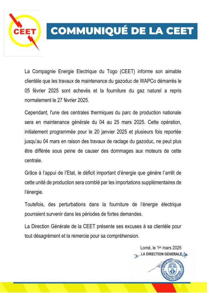 La Compagnie Énergie Électrique du Togo (CEET) informe sa clientèle de la fin des travaux de maintenance du gazoduc de WAPCo, démarrés le 5 février dernier. Depuis le 27 février 2025, la fourniture de gaz naturel a repris normalement avec un approvisionnement stable en énergie.