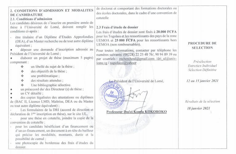 L’Université de Lomé (UL) conformément à sa Politique de Recherche en cours, lance une seconde vague d’appel à candidatures pour les étudiants désireux de s’inscrire en première année de thèse de doctorat dans les Ecoles Doctorales (ED) que sont: