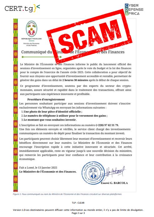 Depuis quelques jours, une grosse arnaque d’investissement en ligne cible les Togolais. En effet, un faux communiqué attribué au Ministère de l’Economie et des Finances circule sur les réseaux sociaux (WhatsApp, Facebook, TikTok…).