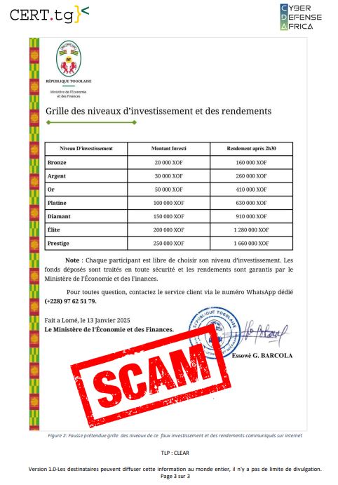 Les personnes intéressées devraient contacter un supposé service client chargé des investissements via WhatsApp sur le +228 97 62 51 79 avec une pièce d’identité et transférer le montant à investir vers un autre numéro qu’il leur sera fourni.