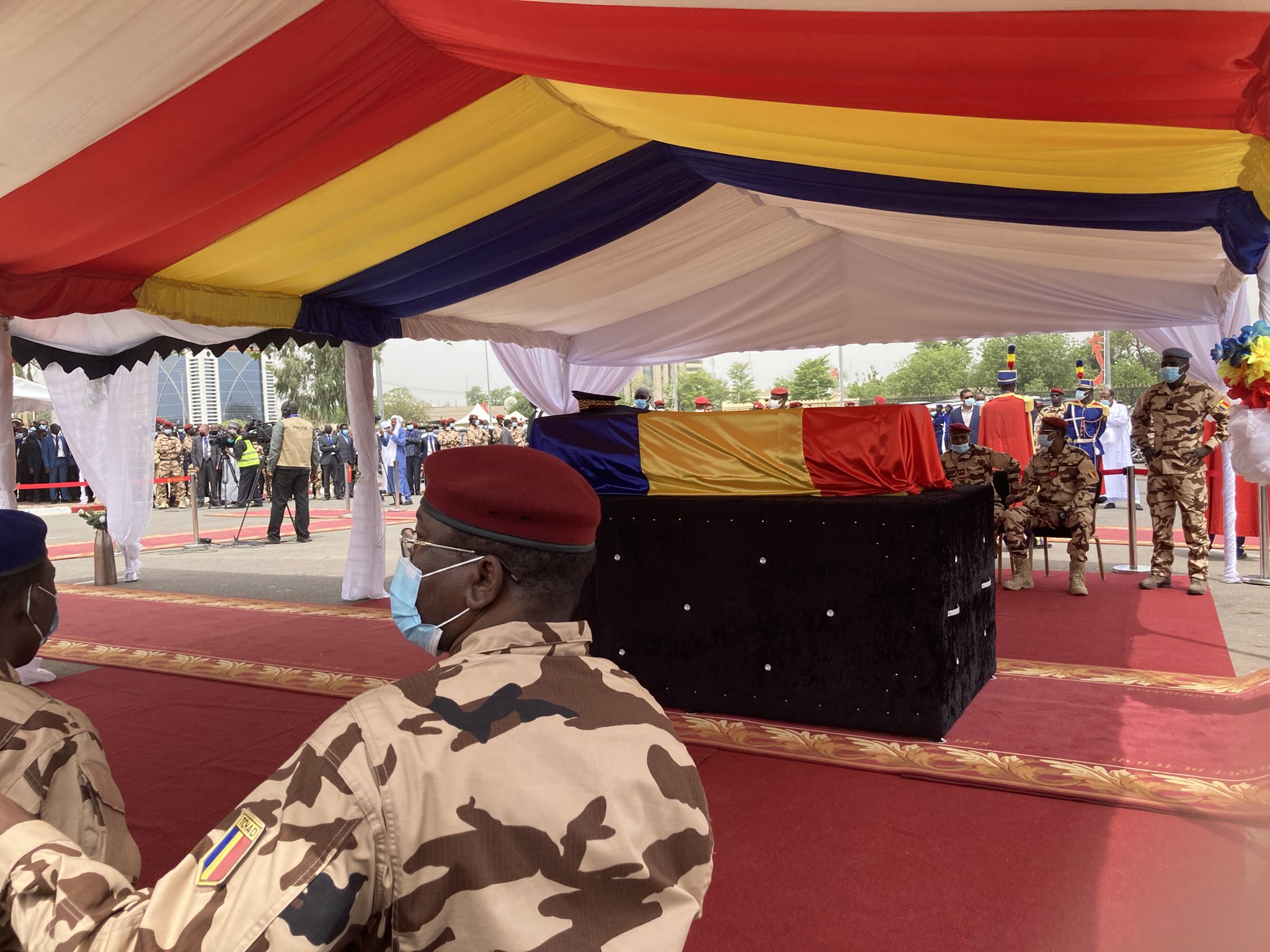 Le cercueil d’Idriss Déby, monté sur le plateau d’un pick-up, drapé du drapeau national et entouré de soldats de la garde présidentielle, est arrivé place de la Nation.