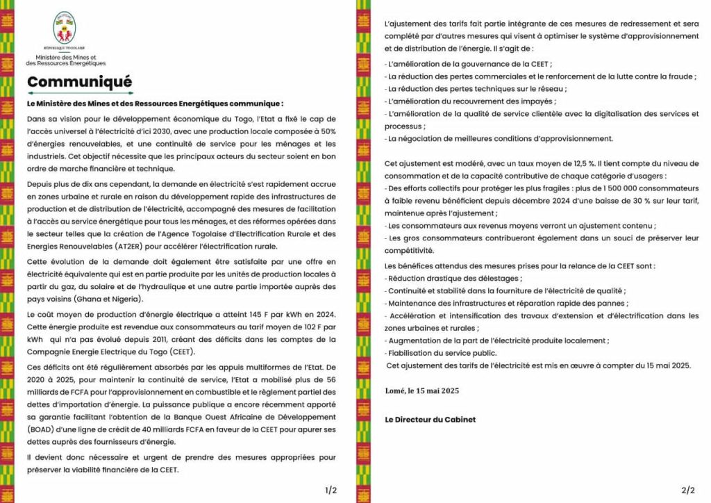 Dans le cadre de sa vision de développement économique, l’État togolais poursuit son objectif ambitieux d’accès universel à l’électricité d’ici 2030, avec une production locale composée à 50 % d’énergies renouvelables. Pour soutenir cette transition énergétique et améliorer la viabilité du secteur, le gouvernement a annoncé un ajustement des tarifs de l’électricité en vigueur depuis le 14 mai 2025.