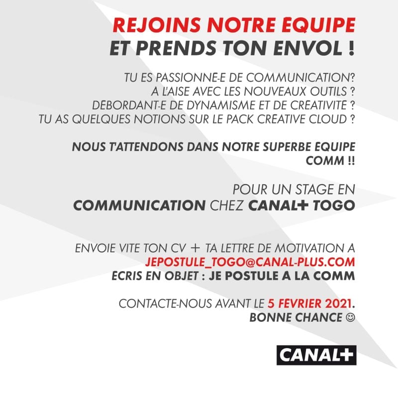 Envoie vite ton CV et ta Lettre de Motivation à l’adresse suivante : jepostule_togo@canal-plus.com !