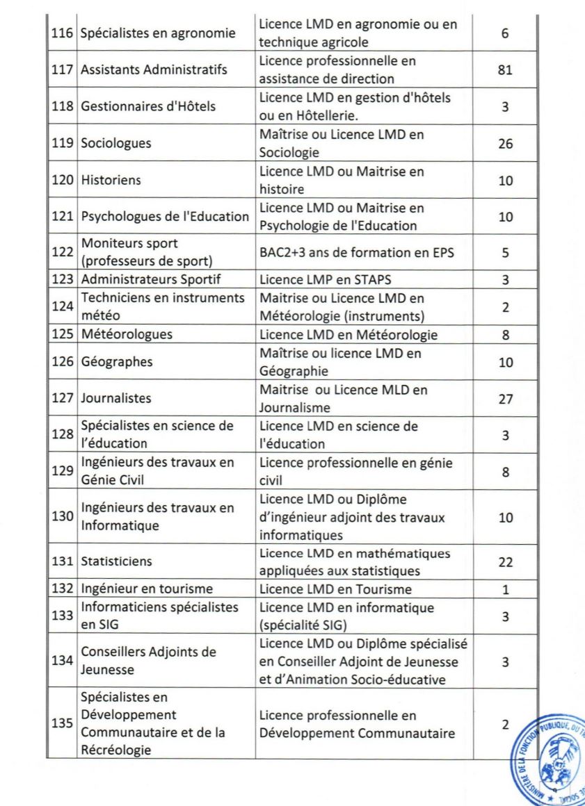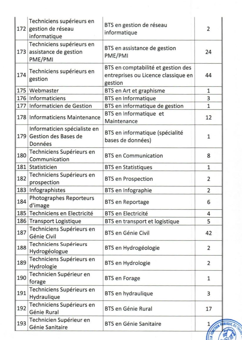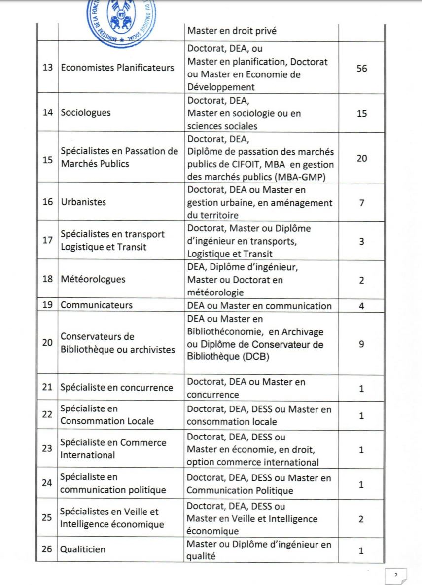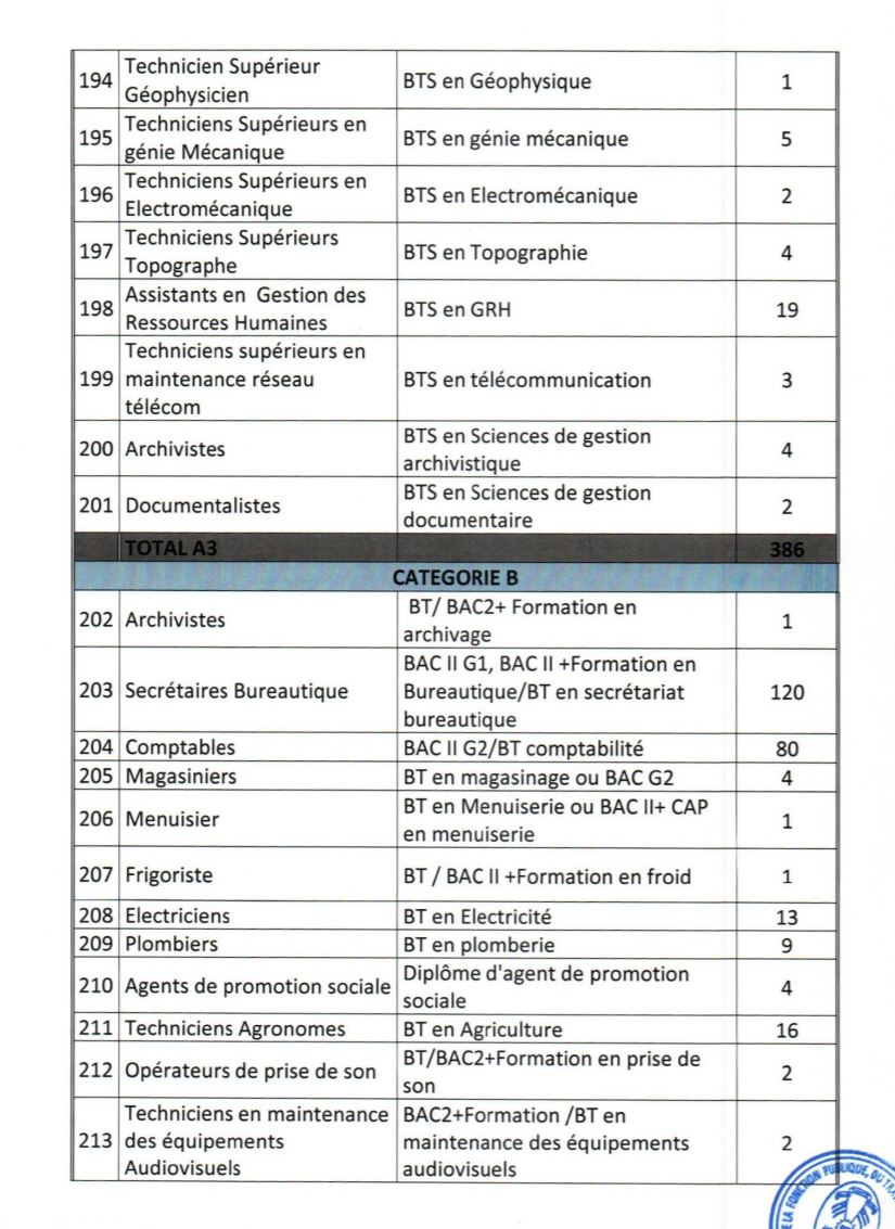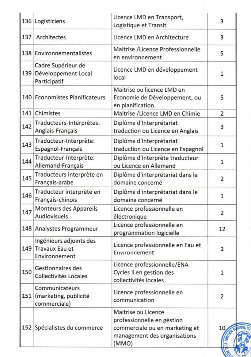 - Etre âgés de dix-huit (18) ans au moins et de quarante (40) ans au plus à la date du concours. Pour les candidats exerçant en qualité de volontaires ou de contractuels au sein des administrations ou des services publics ou parapublics, ou ayant effectué des services antérieurs validables pour la retraite, la limite d’âge est portée à quarante-quatre (44) ans ;