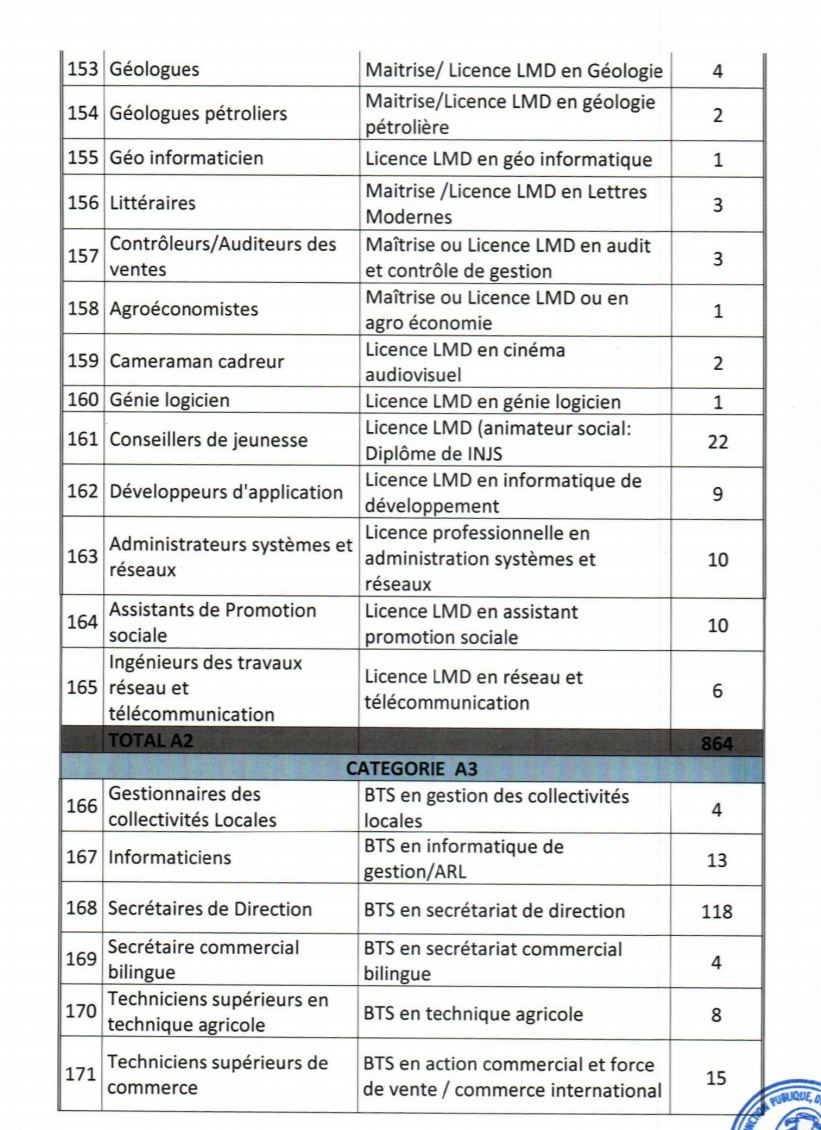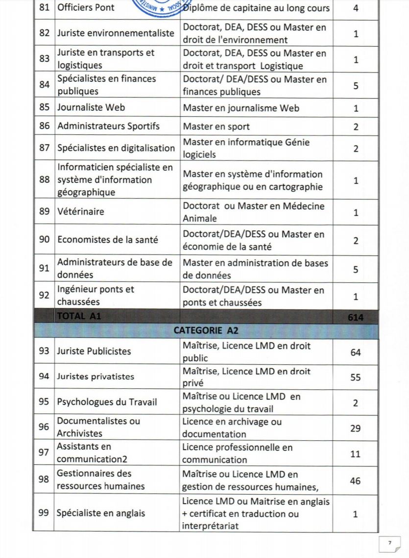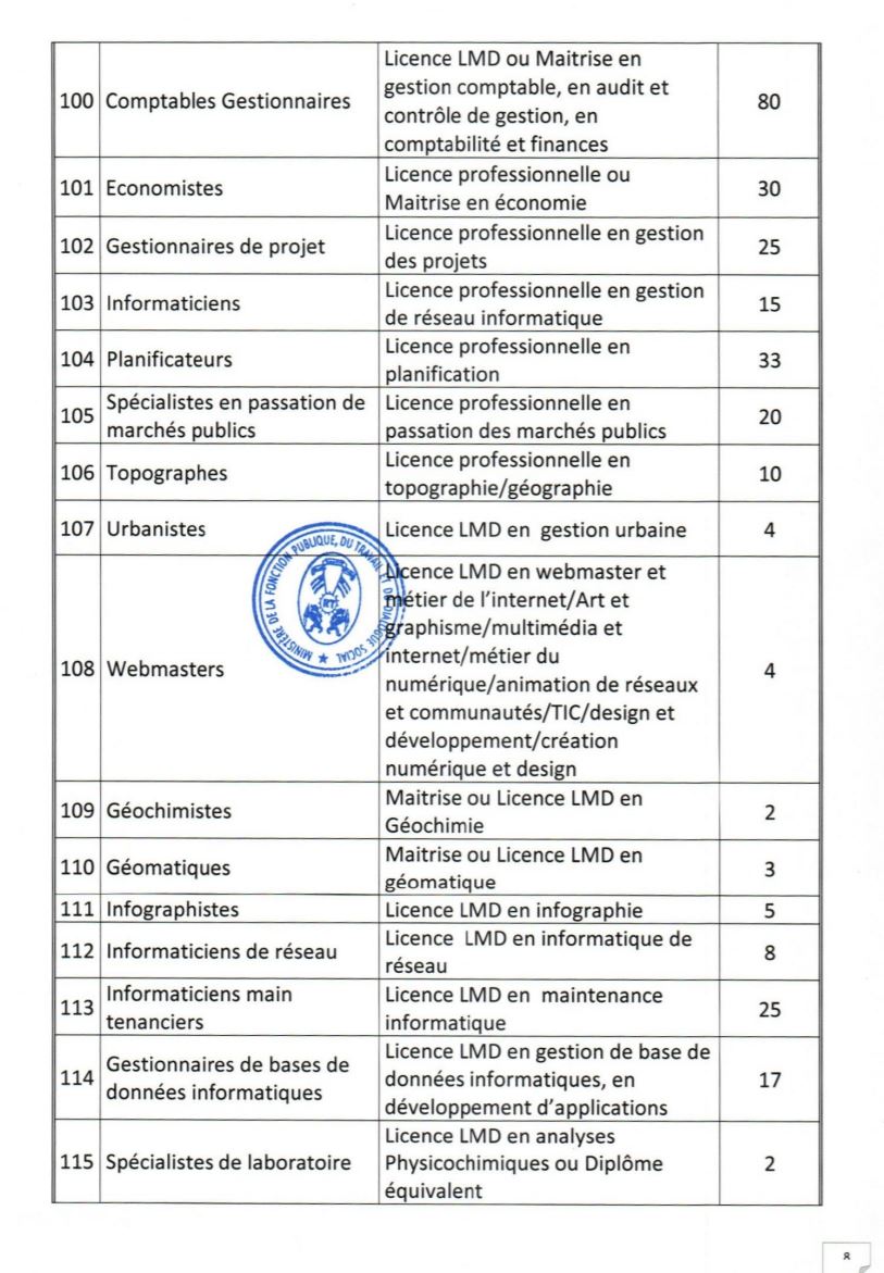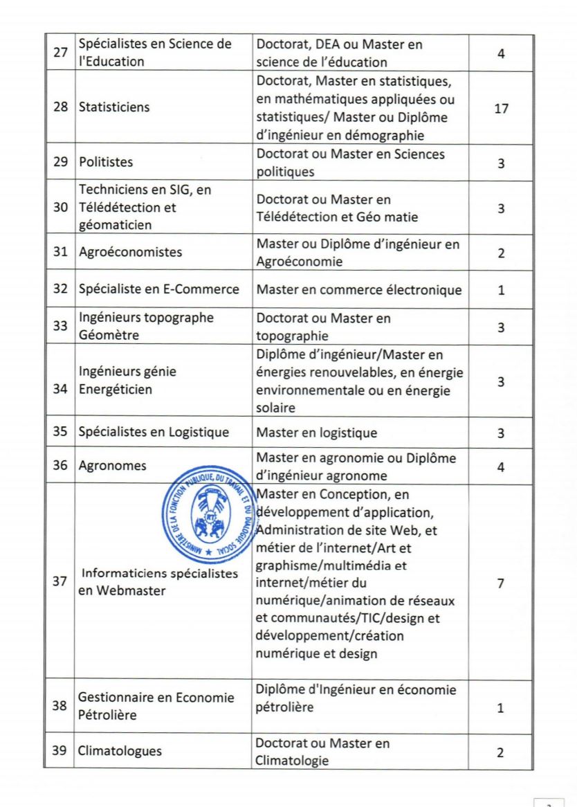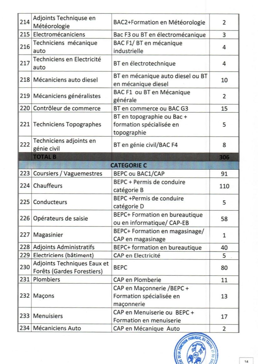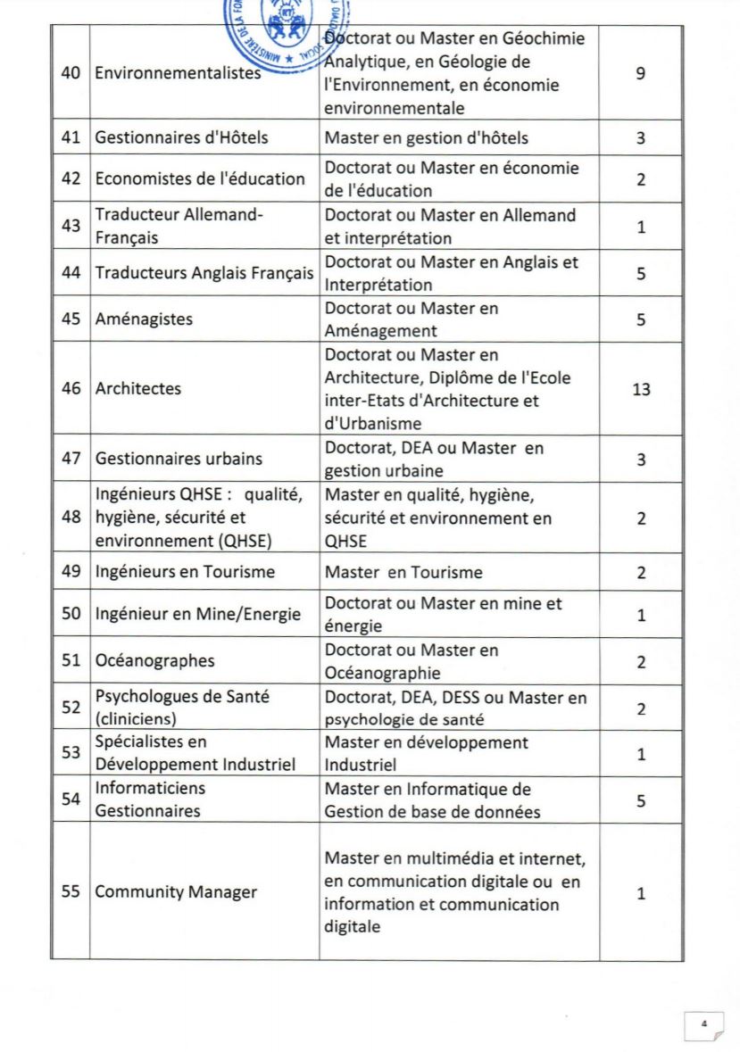 - Etre âgés de dix-huit (18) ans au moins et de quarante (40) ans au plus à la date du concours. Pour les candidats exerçant en qualité de volontaires ou de contractuels au sein des administrations ou des services publics ou parapublics, ou ayant effectué des services antérieurs validables pour la retraite, la limite d’âge est portée à quarante-quatre (44) ans ;