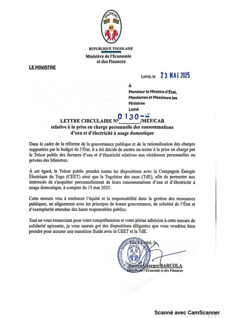 Dans une circulaire datée du 23 mai 2025, le ministre togolais de l’Économie et des Finances, Georges Barcola, annonce la fin de la prise en charge des factures d’eau et d’électricité à usage domestique des ministres par le Trésor public.