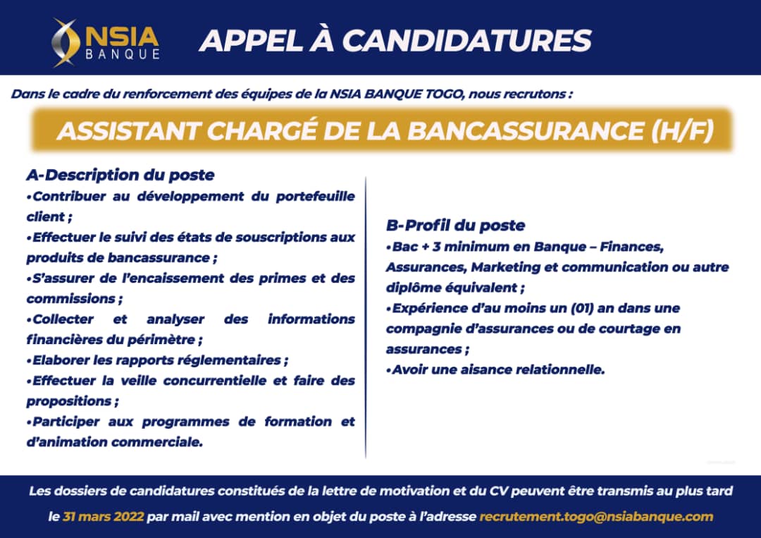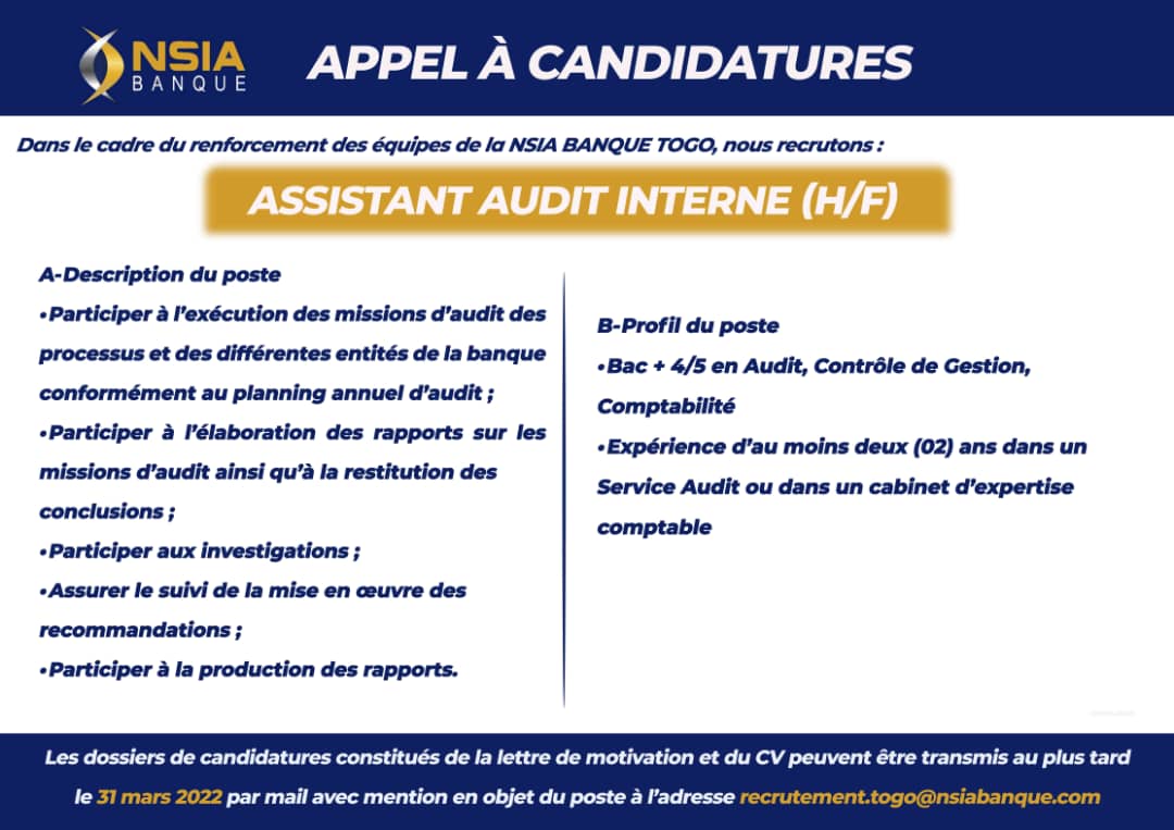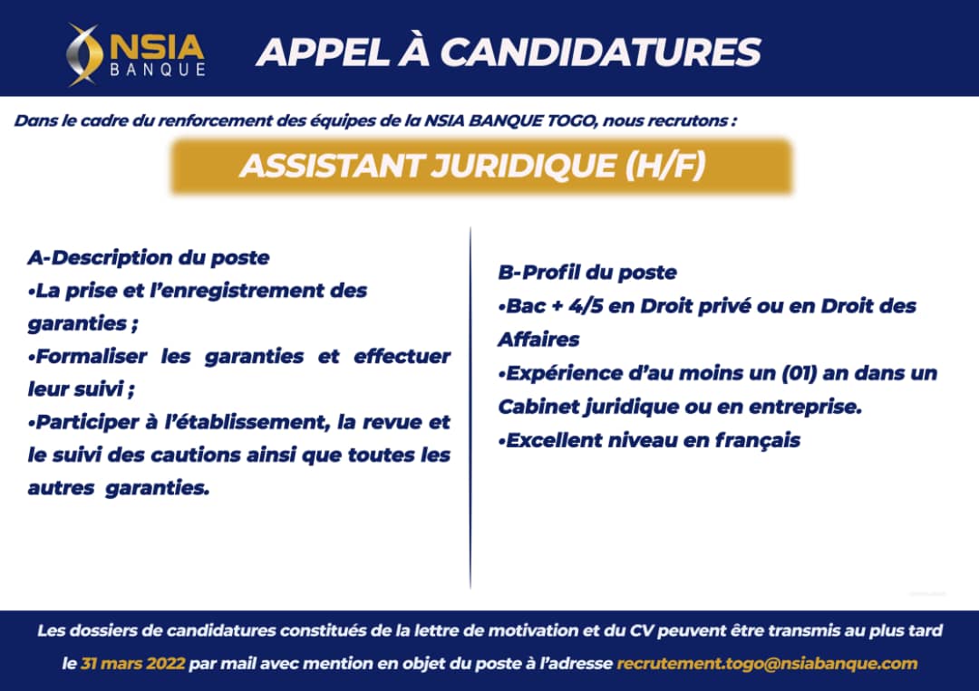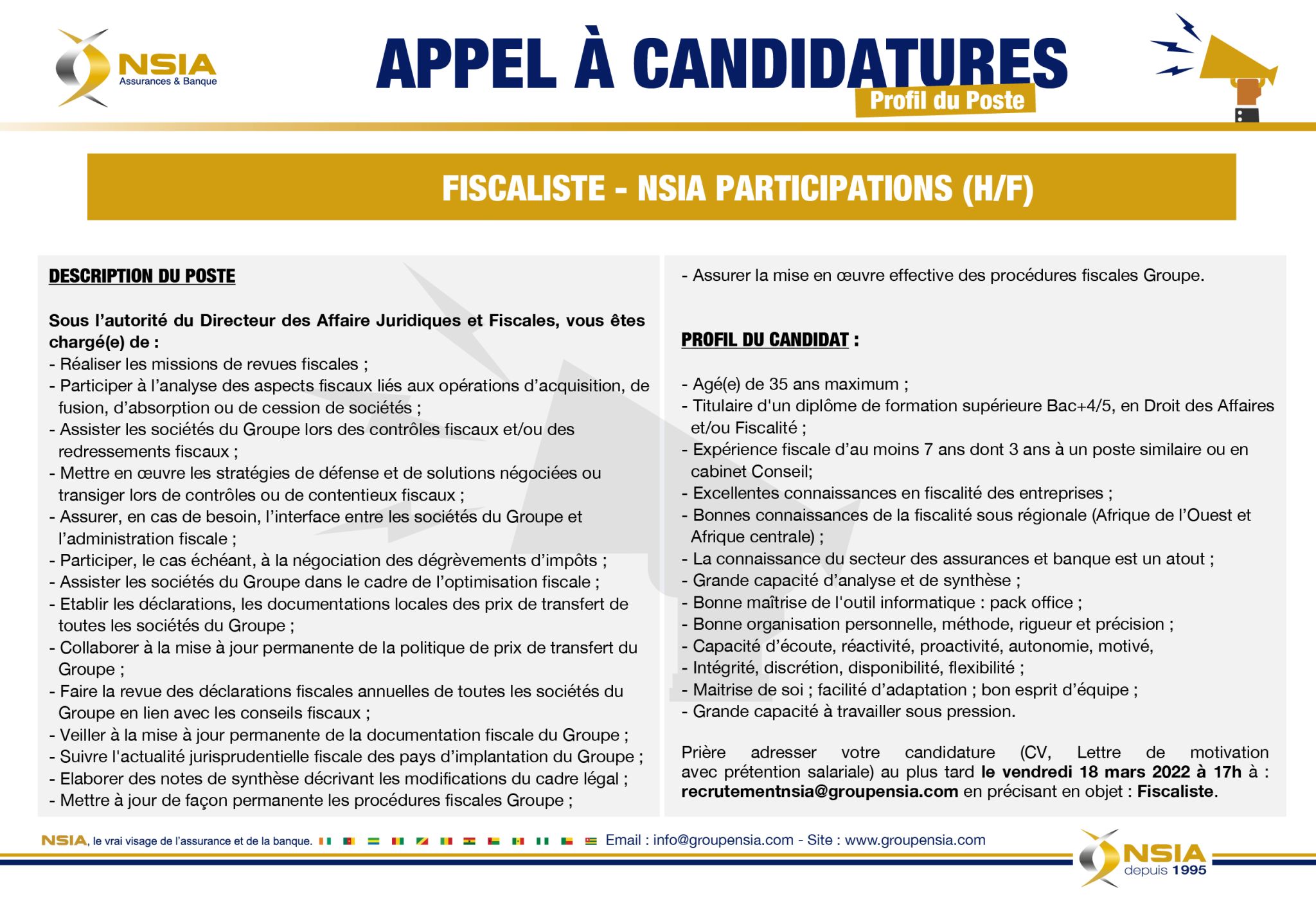 Prière adresser votre candidature (CV, Lettre de motivation avec prétention salariale) au plus tard le vendredi 18 mars 2022 à 17h à : recrutementnsia@groupensia.com en précisant en objet : Fiscaliste.