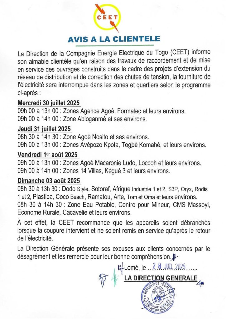 La CEET annonce des interruptions dans la fourniture du courant électrique dans plusieurs quartiers et zones périphériques à compter du mercredi 30 juillet au dimanche 3 août 2025. Ces interruptions interviennent en raison de travaux de raccordement et de mise en service de nouveaux ouvrages. À cet effet, la compagnie publique « recommande que les appareils soient débranchés lorsqu’une coupure intervient ».