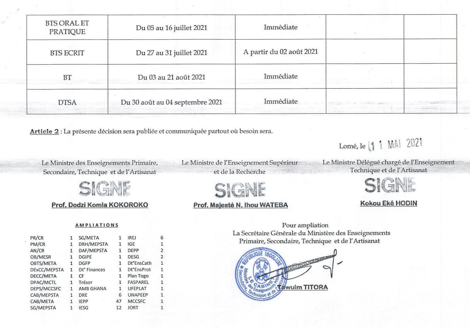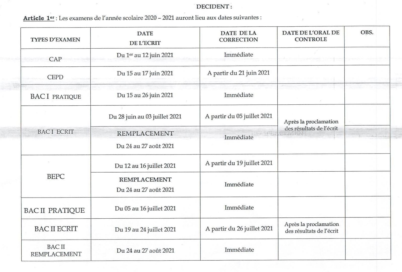 Selon la décision interministérielle, ce réaménagement intervient sur proposition du Directeur des Examens, Concours et Certifications (Enseignement Général), du Directeur des Examens, Concours et Certifications (Enseignement Technique), du Directeur de l’Office du Brevet de Technicien Supérieur et du Directeur de l’Office du Baccalauréat.