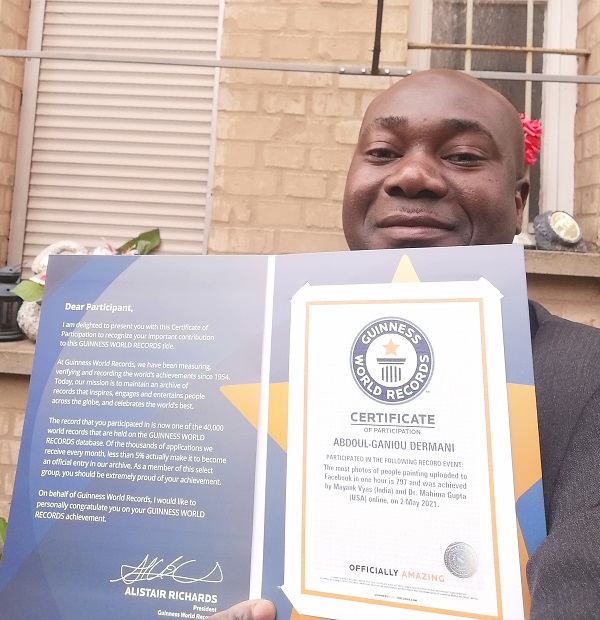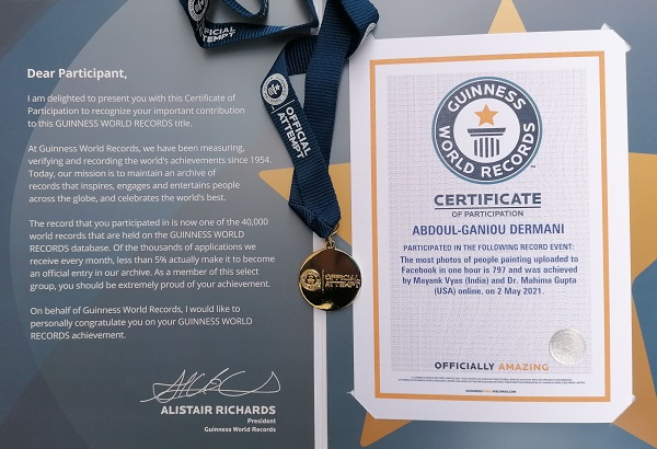 Ce Togolais a obtenu le fameux titre ‘Guinness World Records’. En effet, Guinness World Records a décerné au compatriote, un certificat et une médaille pour avoir participé à l´événement record dénommé « Le plus grand nombre de photos de personnes peignant téléchargées sur Facebook en une heure, est de 797 et a été réalisé par Mayank Vyas (Inde) et Dr. Mahima Gupta (USA) en ligne », le 2 mai 2021.